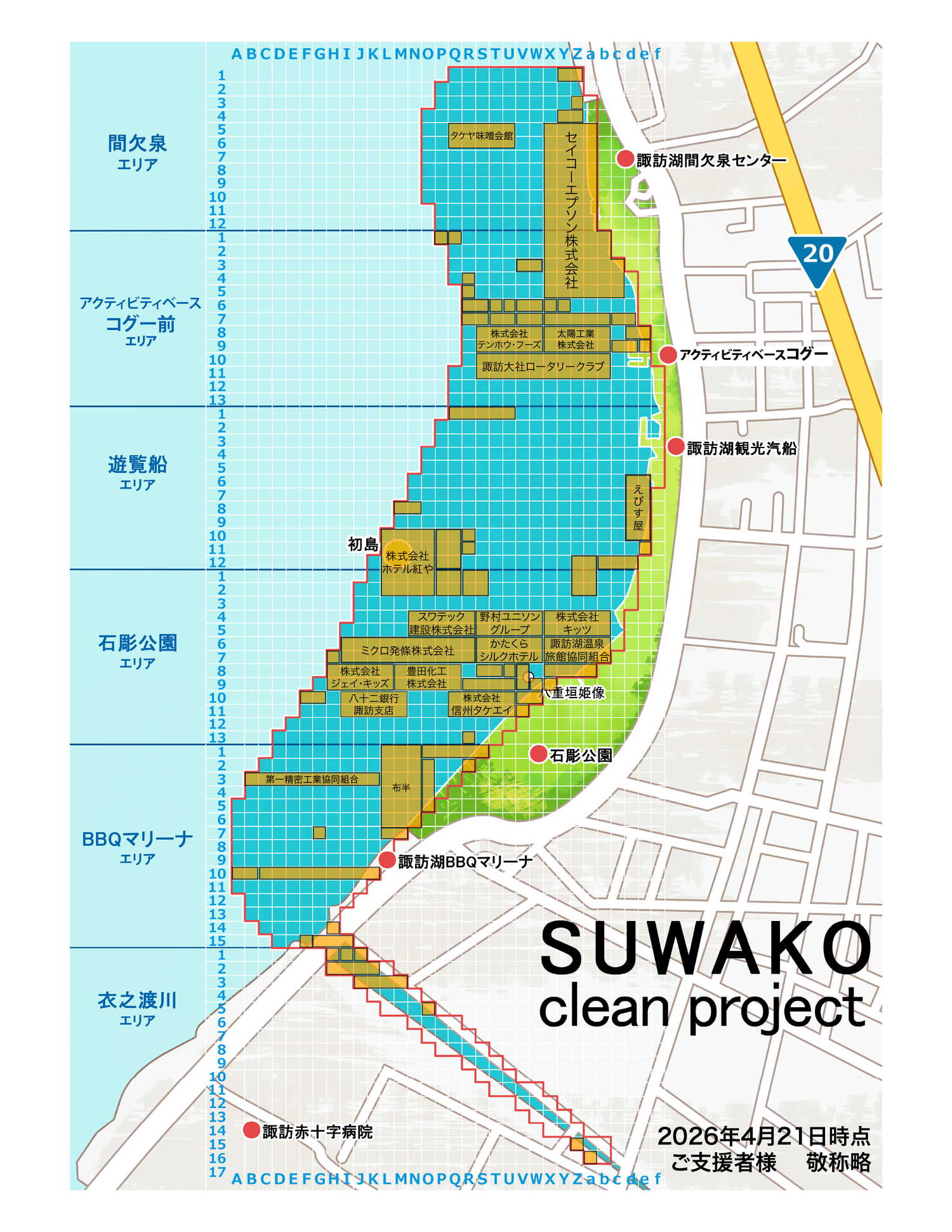 諏訪湖でBBQができる桟橋前に広がるエリアです。天気の良い日には北アルプスの山々が諏訪湖越しに見え、夕方には水面に映る夕日、夜には美しい湖周の夜景が楽しめます。